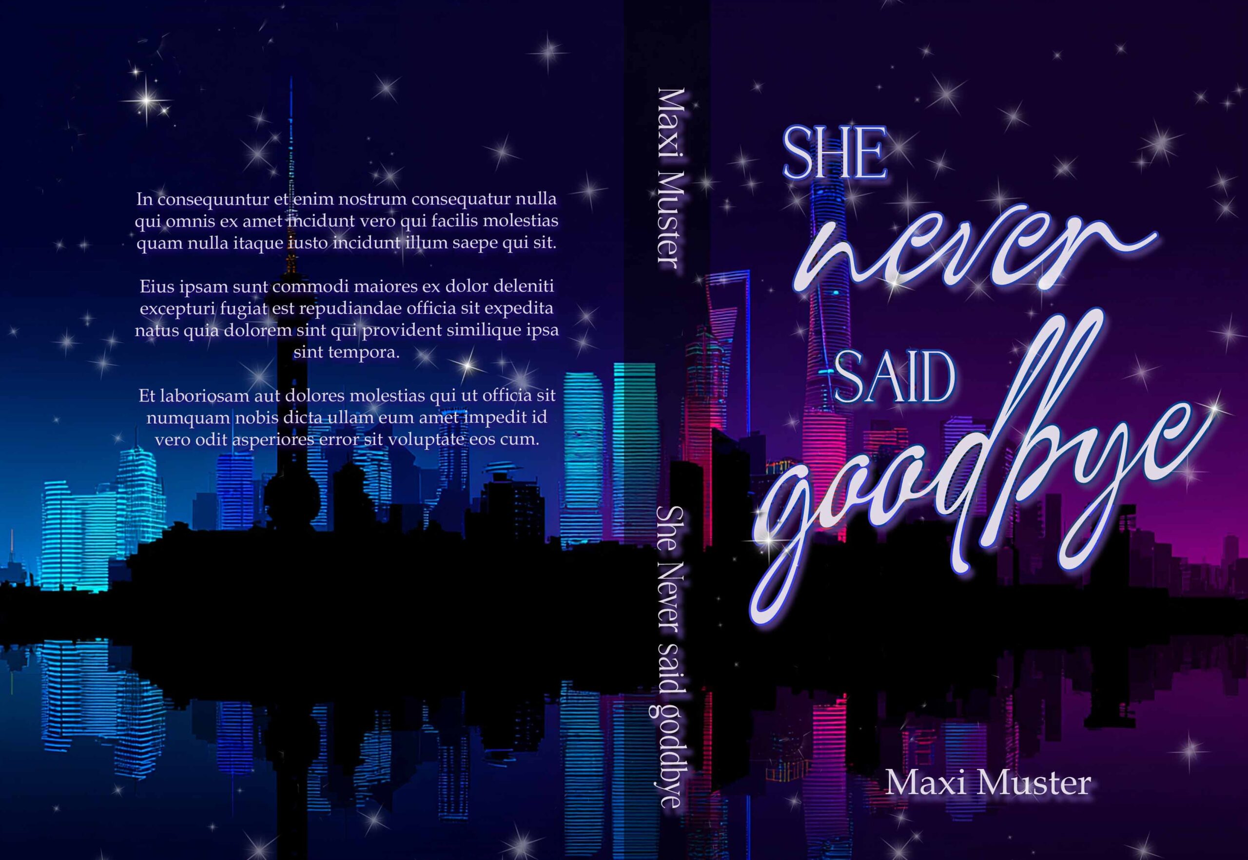 Der Titel „She never said goodbye“ ist exemplarisch und wird selbstverständlich an deine Geschichte angepasst. Auch Autor*innenname und Klappentext werden professionell integriert, das Design präzise auf dein Buchformat abgestimmt.